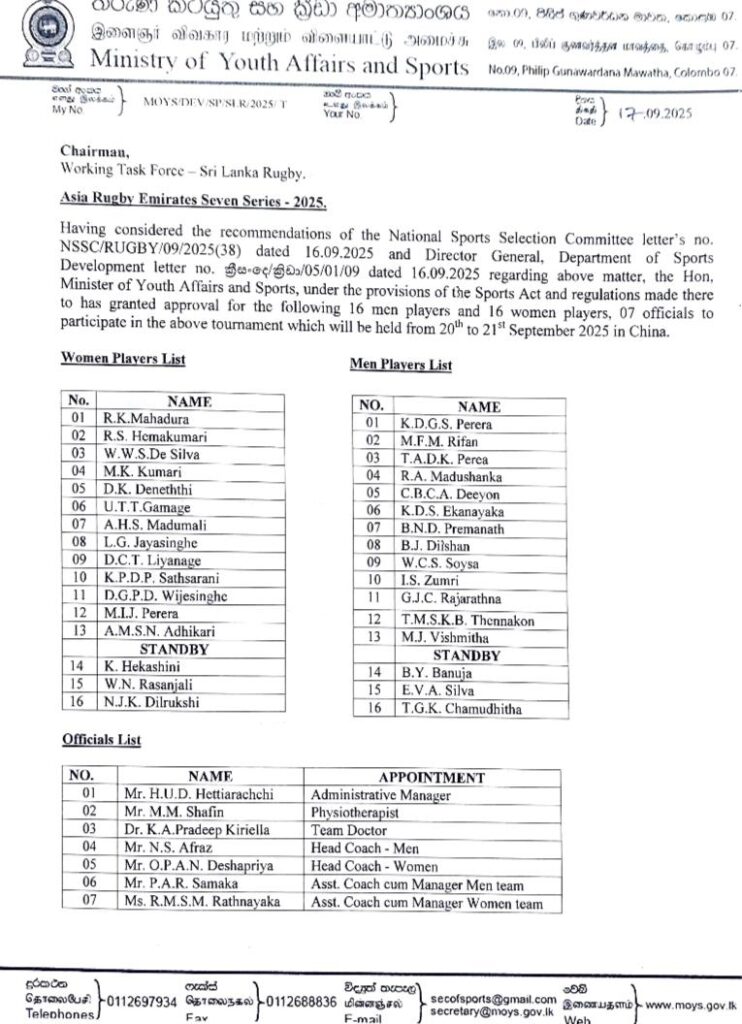 The controversies surrounding Sri Lanka Rugby are no longer mere embarrassments, they are spiraling into a full-blown crisis that now threatens the very survival of the sport. If it isn’t schoolboy matches marred by referee scandals, it’s the chaos of the repeatedly postponed Annual General Meeting and Elections, or the dubious “interim” arrangement gazetted by the Minister of Sports and run through a Working Task Force. Now, matters have sunk even lower, with individuals who hold no official role in Sri Lanka Rugby sneaking their way into national team tours, as exposed during the ongoing Asia Rugby Emirates Sevens Series in China.