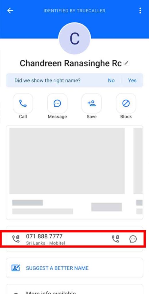 Caption: Image 1 – Chandreen Ranasinghe, Image 2 – The culprit Chandreen Ranasinghe initially shared a malicious post regarding the news editor on a whatsapp group named “SL Rugby Players Association”, Image 3 – Chandreen Ranasinghe identified by Truecaller