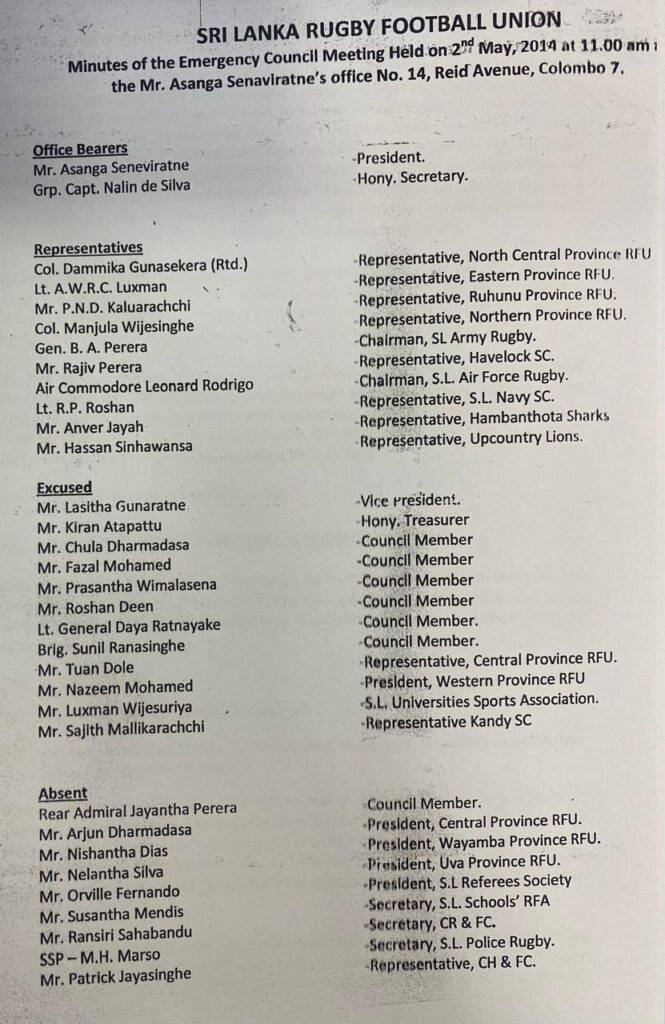 Sri Lanka Rugby is now staring at its very own Watergate moment. The Morning Telegraph, in possession of the secret meeting minutes of a clandestine gathering held at former SLR President Asanga Seneviratne’s private business office at 14 Reid Avenue Colombo 7, can now reveal the full list of those who orchestrated one of the darkest and most shameful chapters in the sport’s history, the illegal drafting of three Fijian nationals into the Sri Lankan team at the 2014 Rugby Asiad.