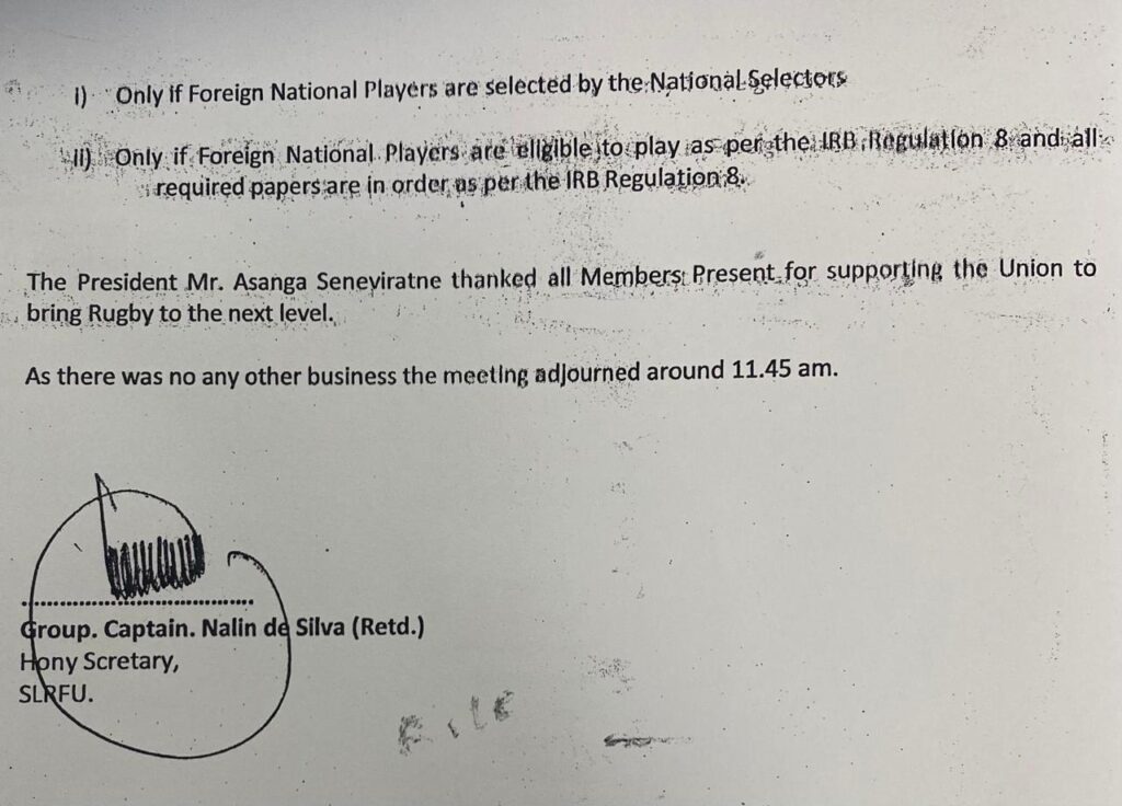 “The Morning Telegraph has uncovered the ultimate smoking gun, the long-buried minutes of Sri Lanka Rugby’s so-called Emergency Council Meeting held 11 years ago. These documents unmask the Dirty Dozen: then SLR President Asanga Seneviratne, Secretary Nalin De Silva, Hassan Sinhawansa, Rajiv Perera, Anver Jayah, and seven Tri Forces officials. In a scheme worthy of Watergate, they conspired to smuggle three Fijians into the national rugby side, a move that disgraced the country and saddled it with a crippling £50,000 fine. The revelation is damning and it demands accountability from the very top.”