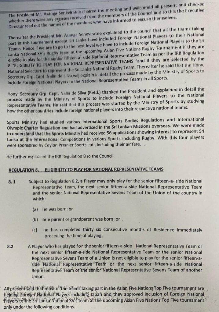 At the meeting, SLR President Asanga Seneviratne declared that if Sri Lanka were to “take its standard to the next level,” foreign players were essential. He invoked IRB Regulation 8 on eligibility, conveniently ignoring that none of the three Fijians satisfied the criteria of birth, parentage, or 36-month residency.