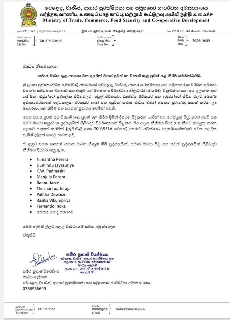 On October 9, a letter signed by the Media Secretary of the Ministry of Trade, Commerce, Food Security and Cooperative Development revealed that a complaint had been lodged with the CID regarding propaganda allegedly spread on social media. The complaint targeted content said to be damaging to Minister Wasantha Samarasinghe and his Public Relations Officer Nimodhi Wickramasinghe. It alleged that false news, fabricated photographs, posts, and notes were circulating online in ways that harmed their personal lives, family lives, professional reputations, and even the lives of their children, while also tarnishing the Minister’s political image. The ministry’s decision to escalate the matter to the CID marks yet another case where state resources are drawn into what critics argue should be private disputes.