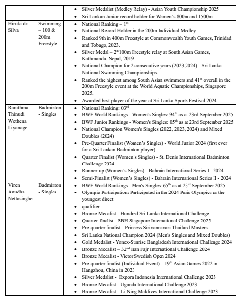 The ceremonial awarding of scholarships took place on 11 October 2025 at the Duncan White Auditorium, Ministry of Sports, during the press conference of Team Sri Lanka for the 3rd Asian Youth Games in Bahrain. Attending the ceremony were Nethmi Ahinsa, Rumesh Tharanga, Aruna Dharshana, Lesandu Arthavidu and Hiruki de Silva, while Ranithma Liyanage, Tharushi Abhisheka and Viren Nettasinghe were represented by their parents due to overseas training commitments.