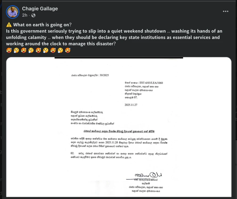 Meanwhile, retired Army Major General Chagi Galle posted on Facebook expressing concern over the government’s performance. In his post, he questioned why the government did not declare essential services and activate a 24 hour disaster response mechanism. His post stated, “What on earth is going on? Is this government, which should have declared major government institutions as essential services and worked 24 hours a day to manage this disaster, trying to slip away with a silent shutdown over the weekend?”