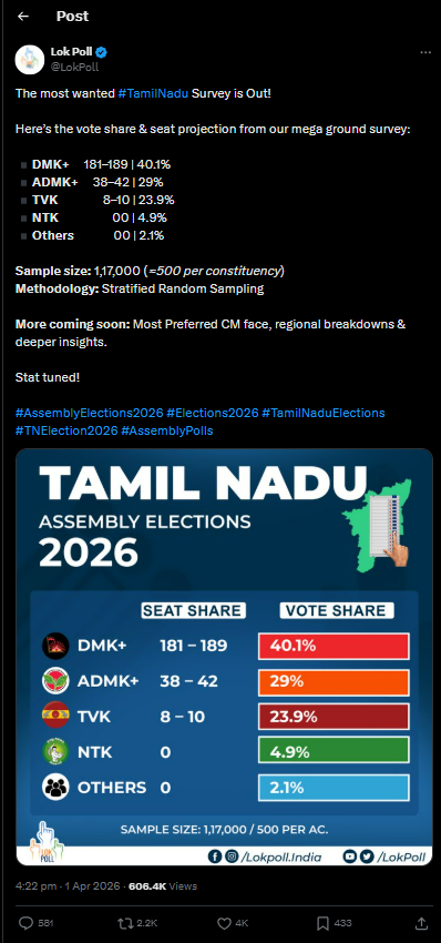 A survey conducted by Lok Poll suggests that the alliance led by Chief Minister MK Stalin could secure between 181 and 189 seats out of 234 constituencies, with an estimated vote share of 40.1 percent.